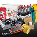 El Noodpakket Premium es nuestro set más completo e incluye, además de todos los artículos del paquete Pro, suministros adicionales para situaciones de emergencia prolongadas, como por ejemplo una ración de emergencia y un filtro de agua que se puede conectar al grifo.